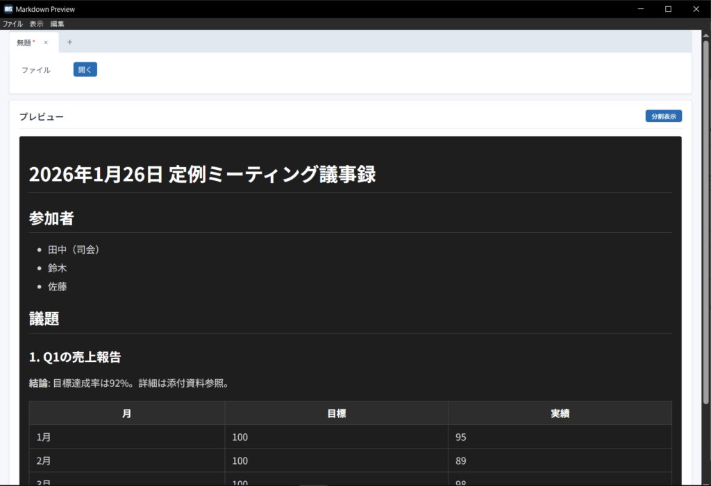 「編集はしない、見るだけ」というときに便利です。AIが出力したMarkdownをそのまま確認したいとき、このモードでさっと見られます。