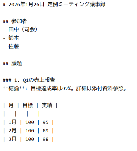たとえば、AIに「議事録をMarkdownで出力して」とお願いしたとします。ChatGPTやClaudeは、きれいに構造化されたテキストを返してくれる。見出しがあって、箇条書きがあって、表もある。