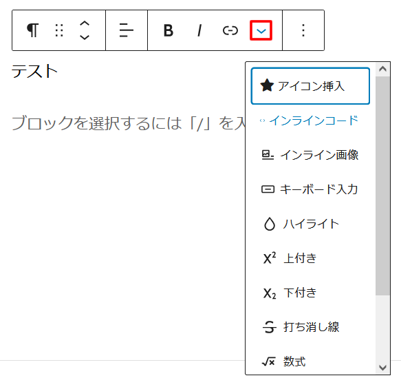 この機能は、テキストを入力できるブロックのツールバーへのアイコン挿入機能です。