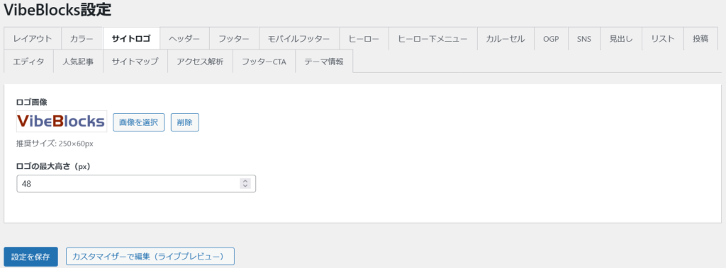 サイトロゴ設定 VibeBlocks設定 2026年2月12日 (更新: 2026年2月13日) ヘッダーのロゴ画像の設定が出来ます。 この画像設定をしない場合は、ヘッダーにはサイト名がテキストで表示されます。 ロゴの最大高さを設定する事で、ロゴの表示サイズの調整が出来ます。 この記事をシェア タグ: 外観 « リストのデザイン設定 ヘッダーの設定 »