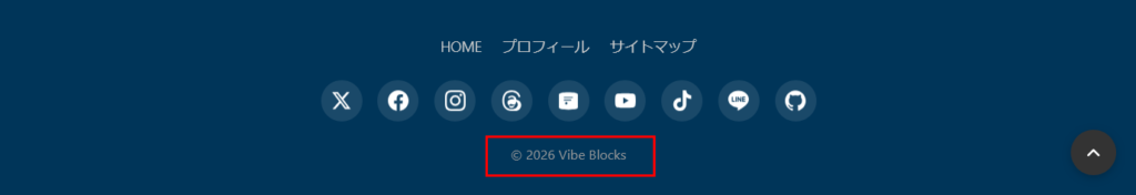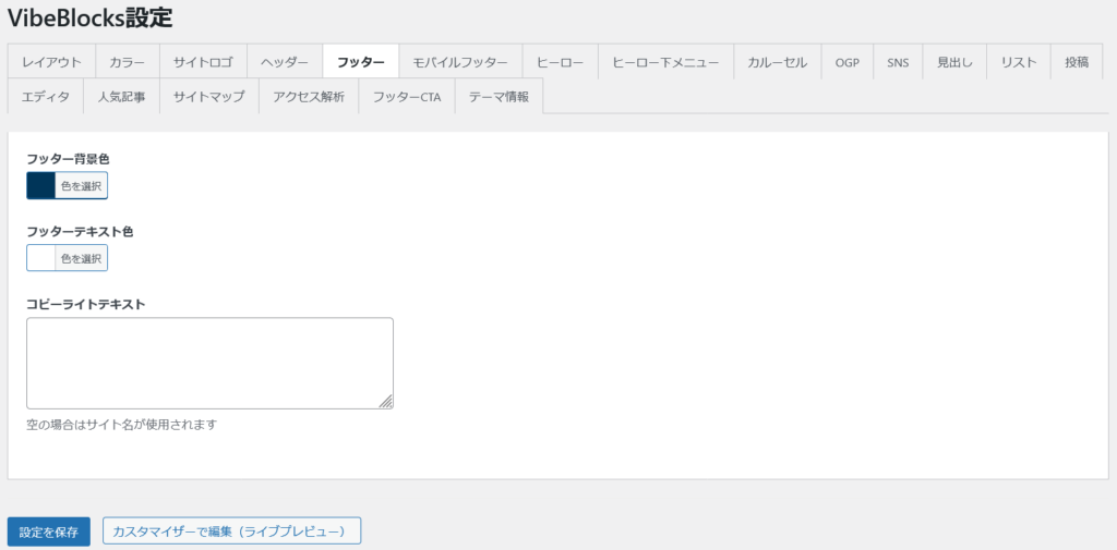 フッターのデザイン設定 VibeBlocks設定 2026年2月12日 (更新: 2026年2月13日) フッターの背景色やテキスト色の設定が出来ます。 ページ最下部のコピーライトの文字列の変更もできます。 コピーライトテキストは、空欄の場合は、「© 2026 サイト名」 が表示されます。 この記事をシェア タグ: レイアウト « ヘッダーの設定 モバイルフッターの設定 »