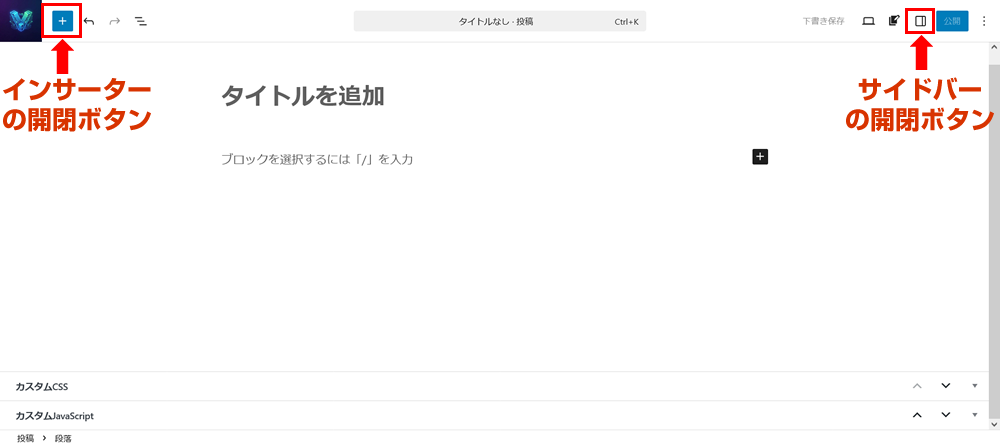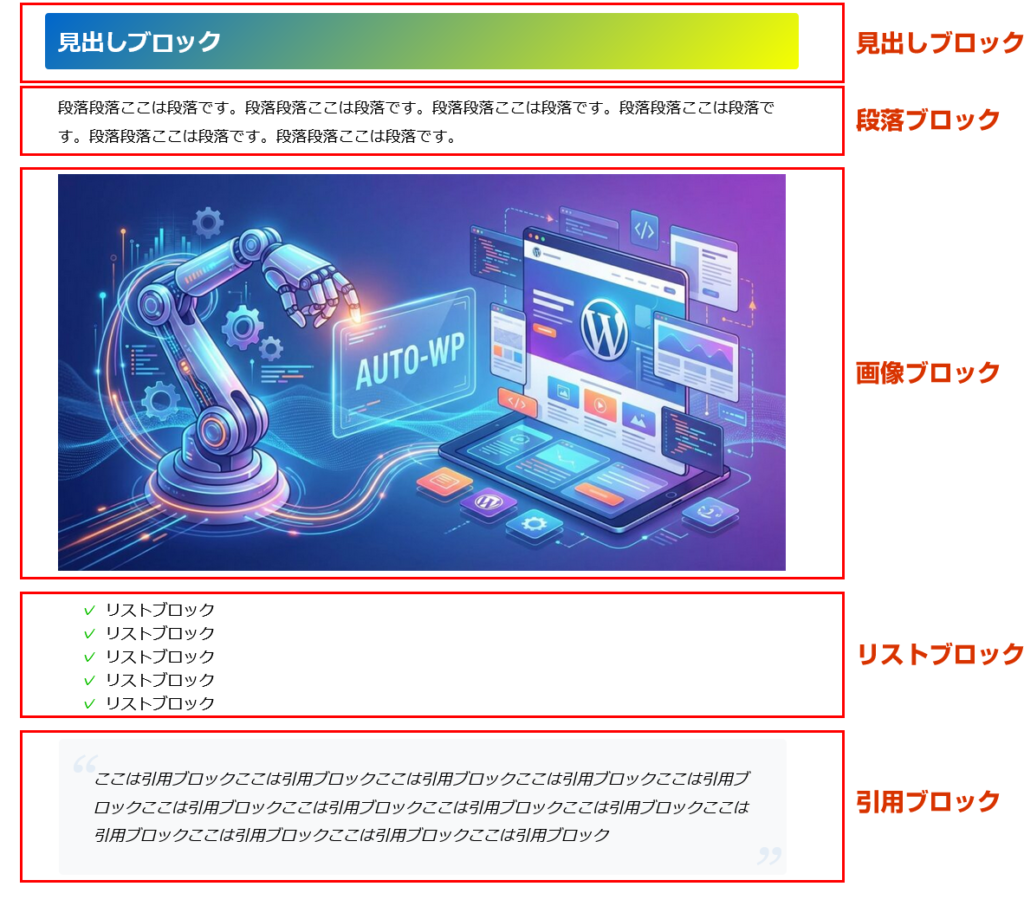 ブロックエディタの構成は、以下の4つのブロックで構成されています。