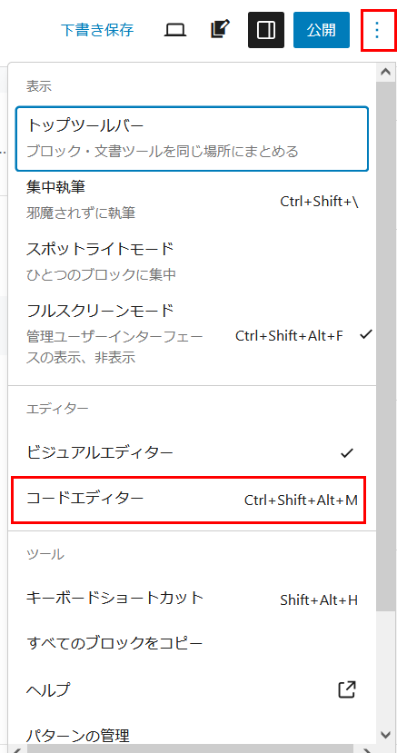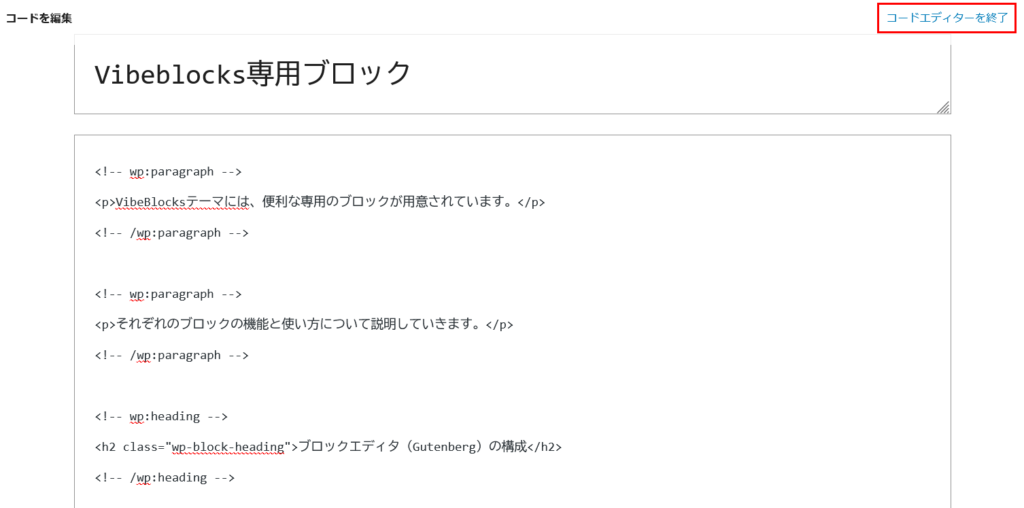 右上の、「コードエディタ―を終了」をクリックするとビジュアルエディタに戻ります。