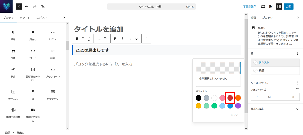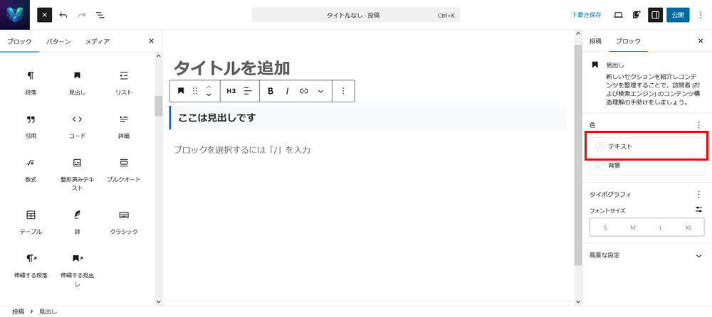 見出しブロックを選択し、サイドバーの「テキスト」をクリック。