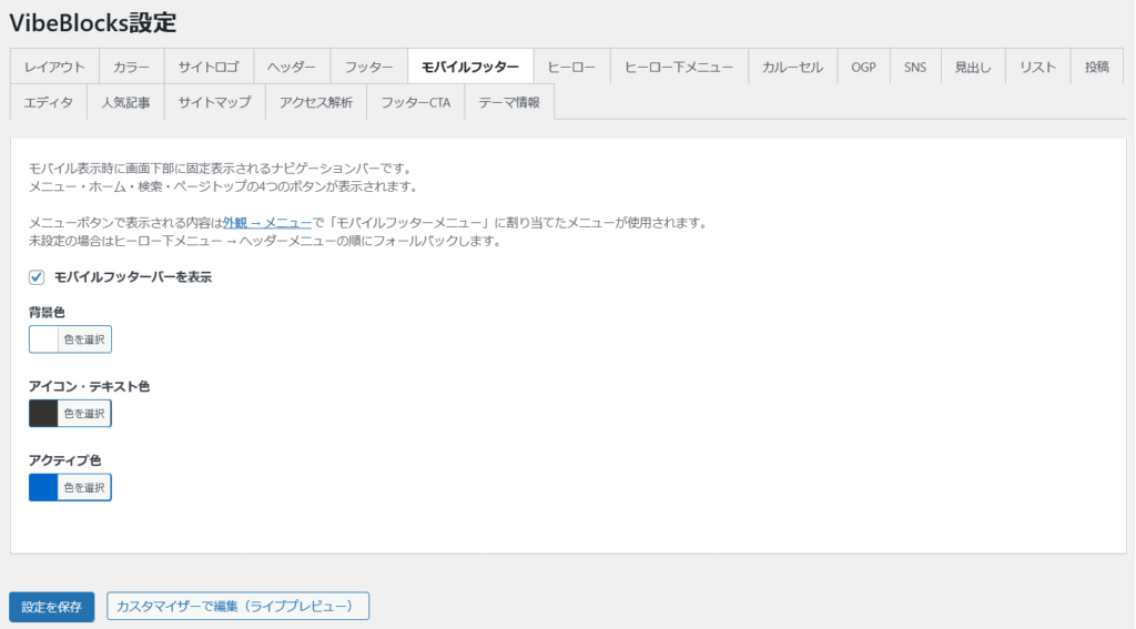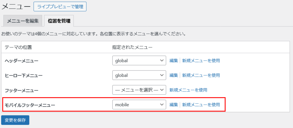 サブメニューで表示される内容は外観 → メニューで「モバイルフッターメニュー」に割り当てたメニューが使用されます。
