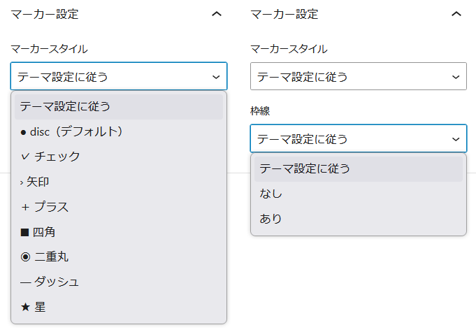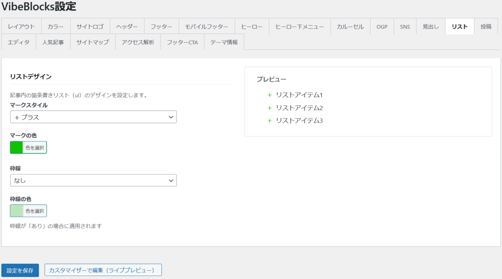 リストのデザイン設定 VibeBlocks設定 2026年2月12日 (更新: 2026年2月13日) リストタグのマーカーと枠線のデザインをカスタマイズする事が出来ます。 個別デザイン修正について リストブロックを選択して、エディタの右側で個別に編集出来ます。 この記事をシェア タグ: 外観 « 見出しのデザイン設定 サイトロゴ設定 »