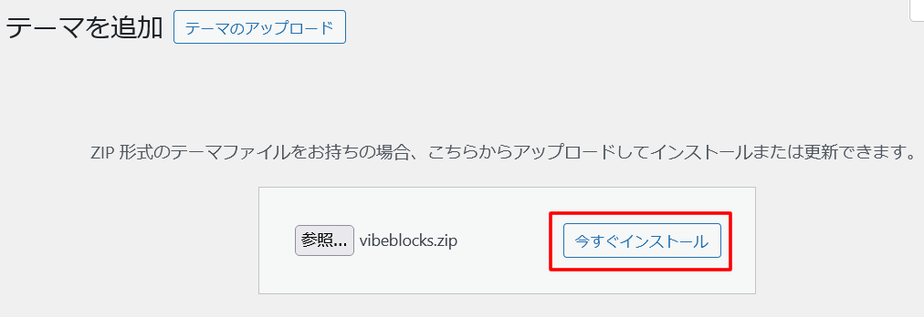「有効化」をクリックしてVibeblocksテーマを有効化すれば完了です。