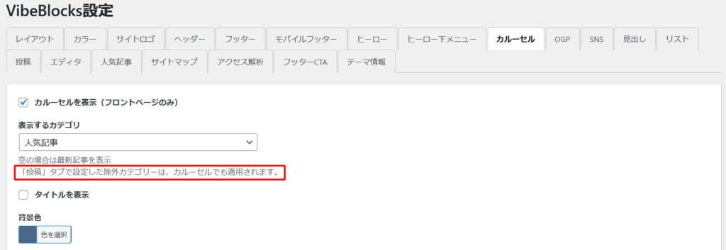投稿タブで設定した、除外カテゴリーが、カルーセルにも適用される仕様のため、わかりやすくするために以下の表記を追加しました。